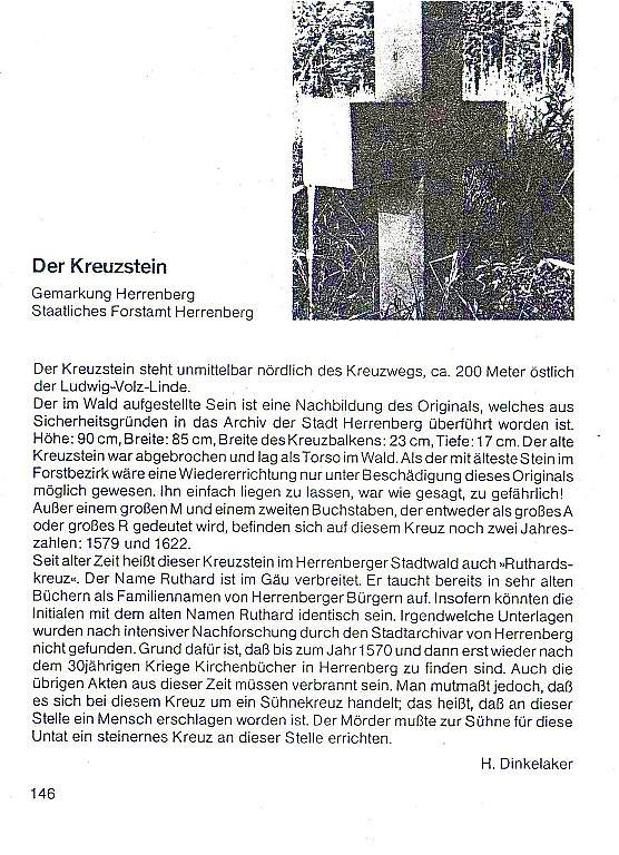 | Vermutlich Sühnekreuz für ein Mitglied der Familie Ruthardt. Der Name Ruthardt ist im Gäu sehr verbreitet. Das orig. Kreuz ist im Fruchtkasten von Herrenberg (Bild3). |