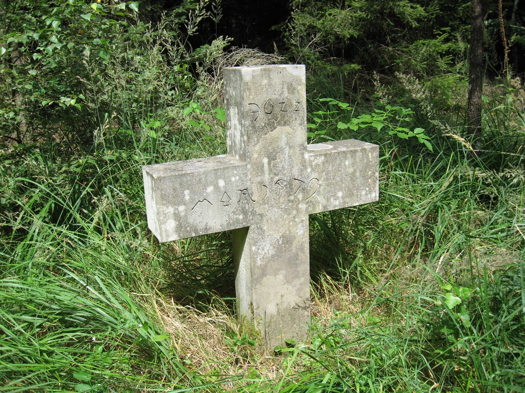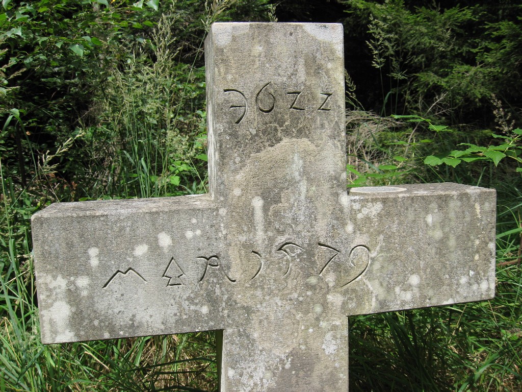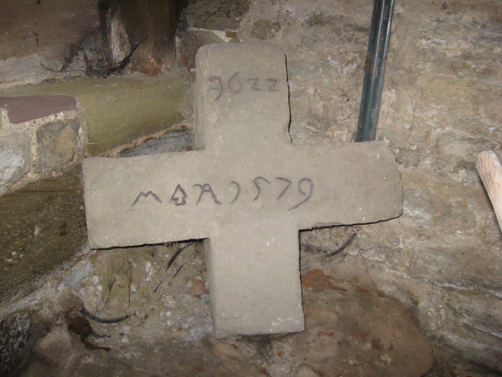 | im Kopf "1622", auf dem linken Arm "M R" (Initialen), dazwischen Pflugschar, in Kreuzmitte "1579" |