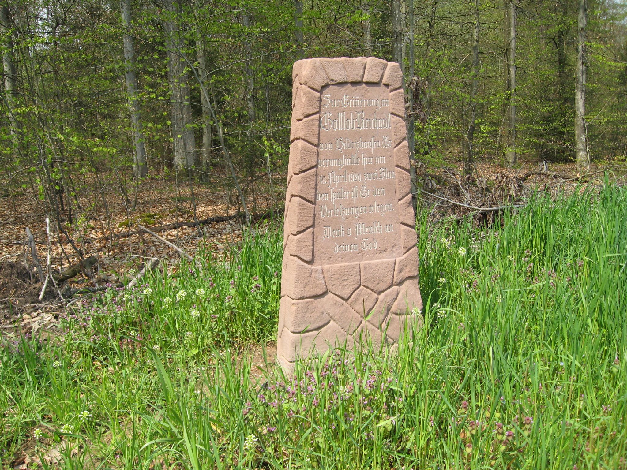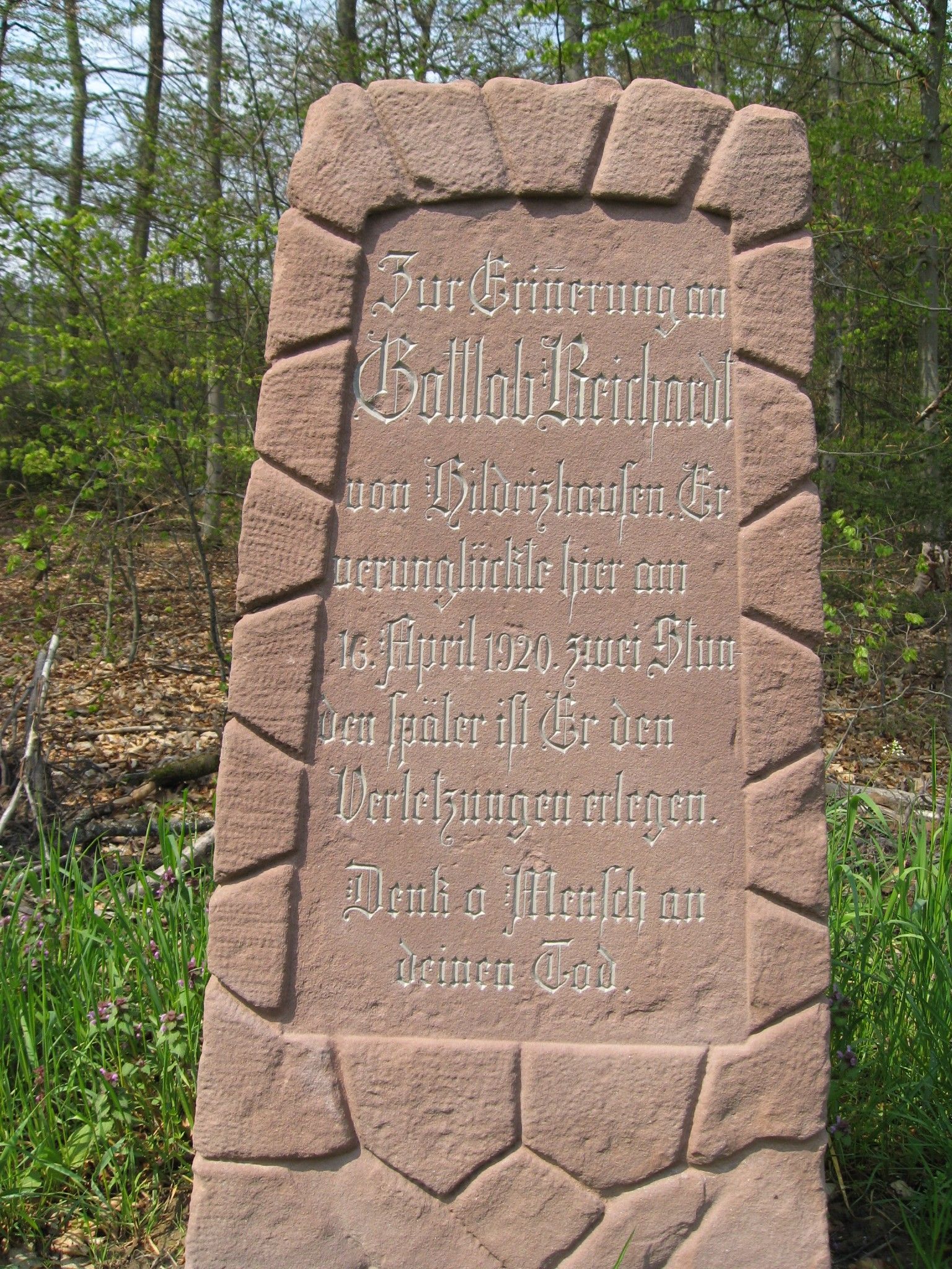 | "Zur Erinnerung an / Gottlob Reichardt / von Hildritzhausen. Er / verunglückte hier am / 16. April 1920. zwei Stun / den später ist Er den / Verletzungen erlegen. / Denk o Mensch / an Deinen Tod" |