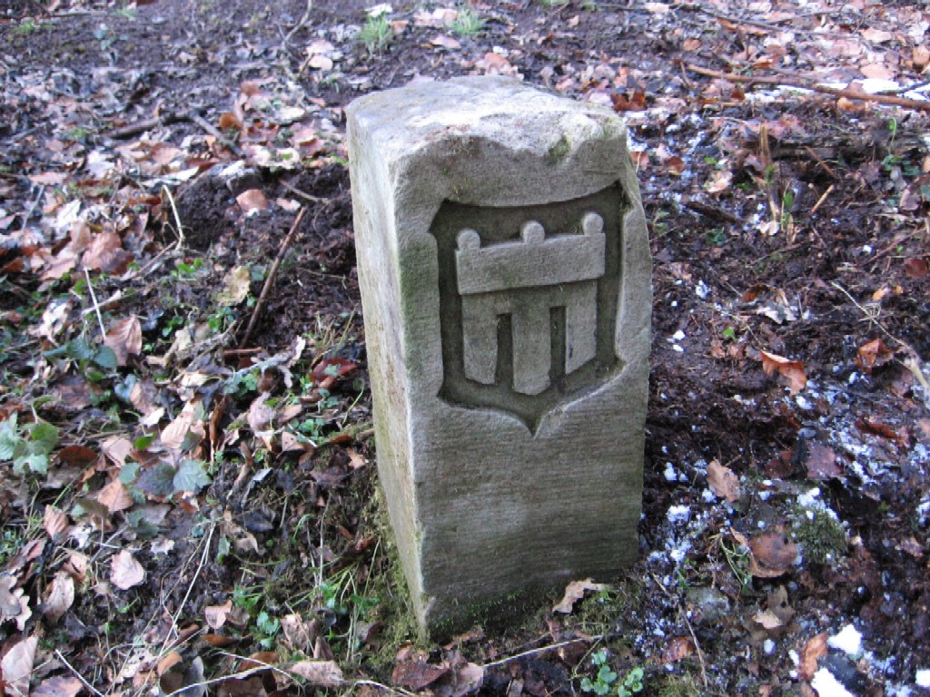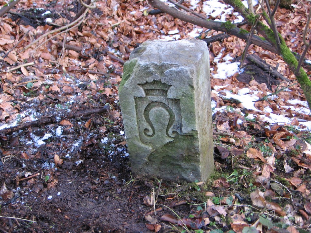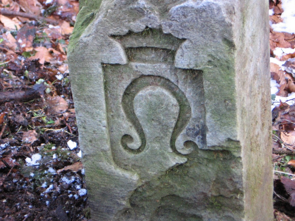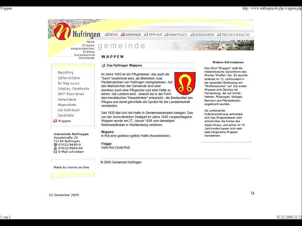 | Im Jahre 1683 ist ein Pflugmesser, das auch als "Sech" bezeichnet wird, als Markstein- bzw. Fleckenzeichen von Nufringen nachgewiesen. Auf den Markzeichen der Gemeinde sind aber daneben auch eine Pflugschar und eine Hafte zu sehen. Die Letztere wird - obwohl sie in der Form dem heraldischen "Kesselrinken" entspricht - als Bestandteil des Pfluges und damit gleichfalls als Symbol für die Landwirtschaft verstanden. Heute Wappen von Nufringen. |