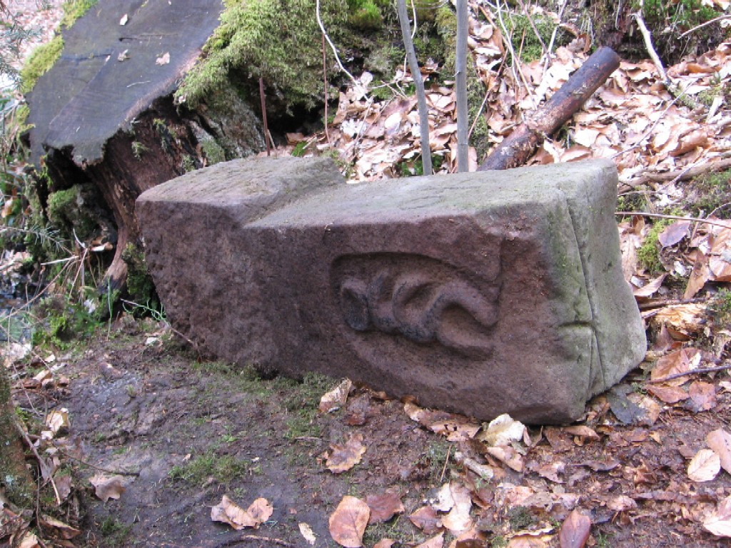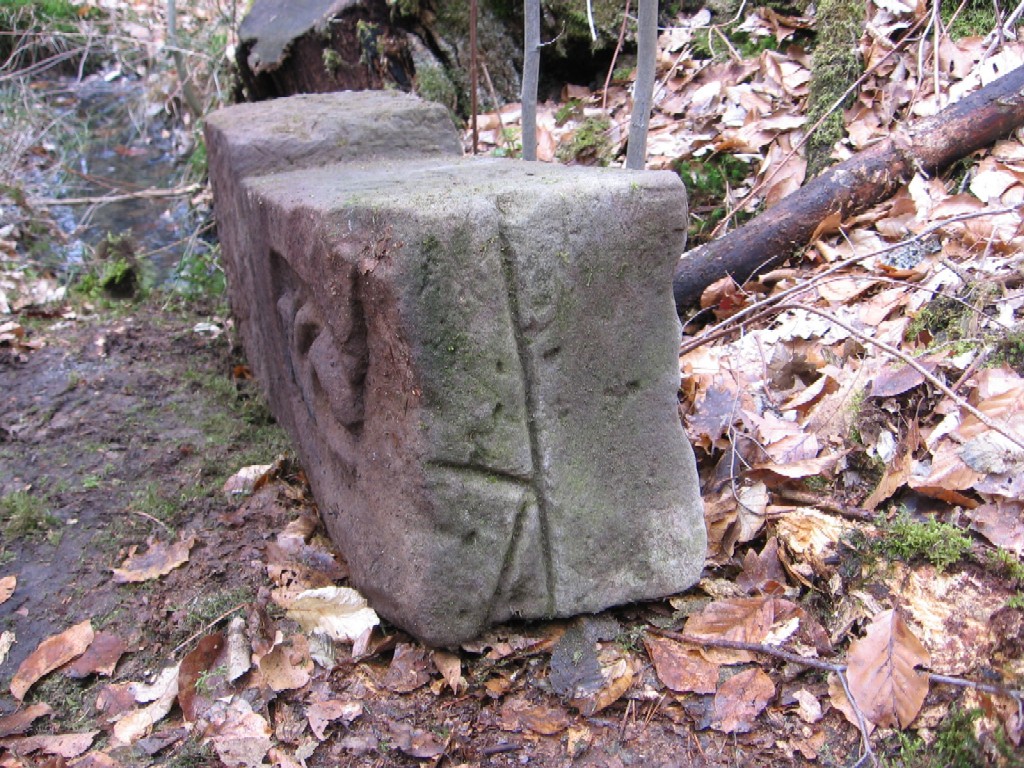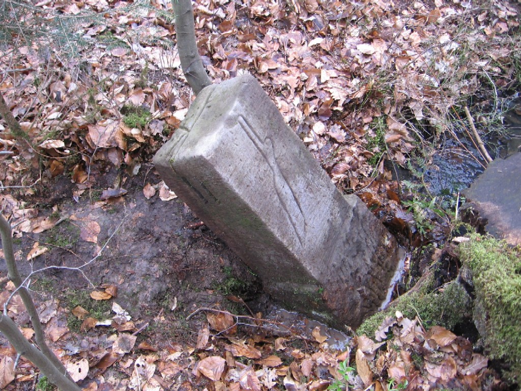 | Grenzstein zu Nufringen, Hildrizhausen und Rohrau. Stein war umgefallen, jetzt notdürftig aufgestellt. Es ist genaugenommen ein "Viermärker", denn der Teil, der auf Nufringen verweist, ist noch einmal geteilt: Nufringer Privatwald und Nufringer Pfarrwald. | Knotenpunkt |