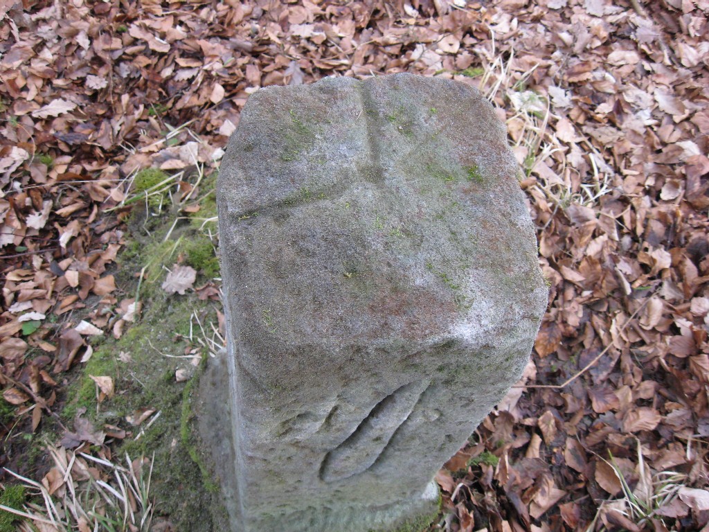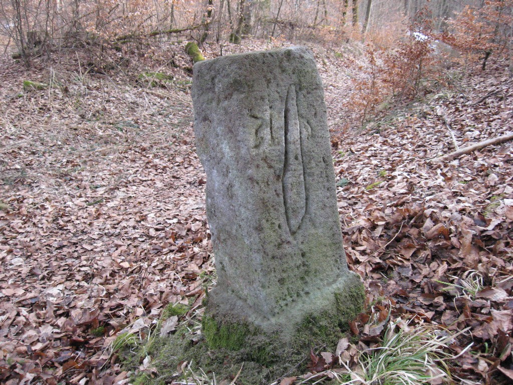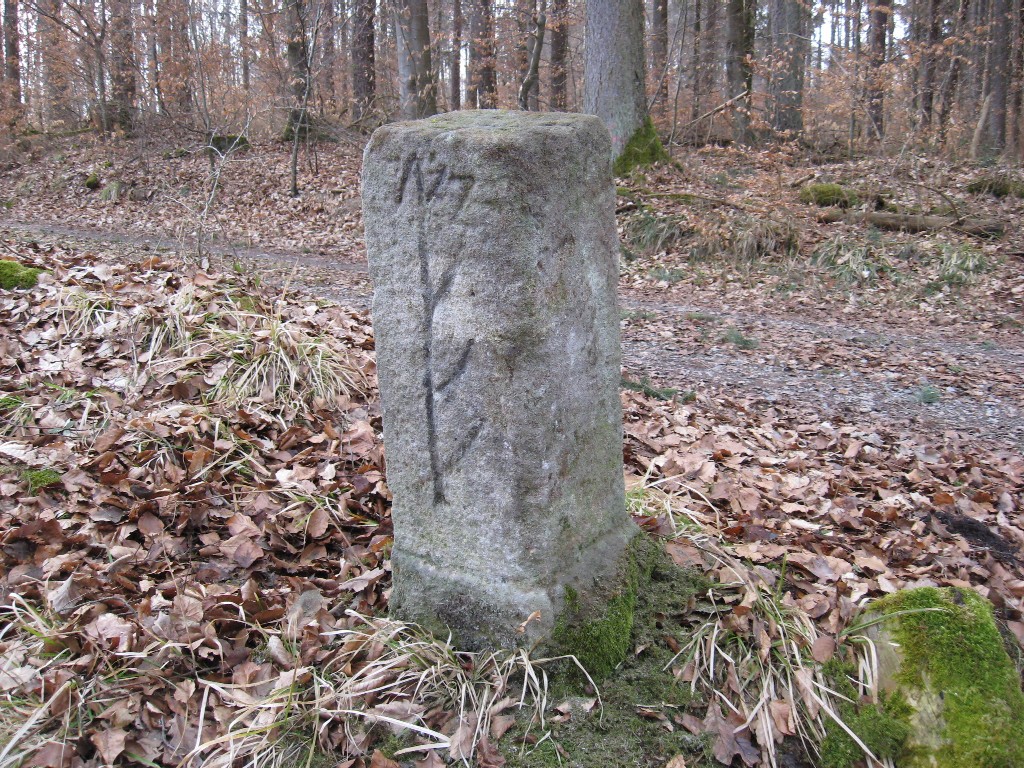 | steht nicht an einer heutigen Gemeindegrenze. Wohl Markungsgrenze von Staatswald (Hirschstange) zu Mönchberg (Pflugmesser). |