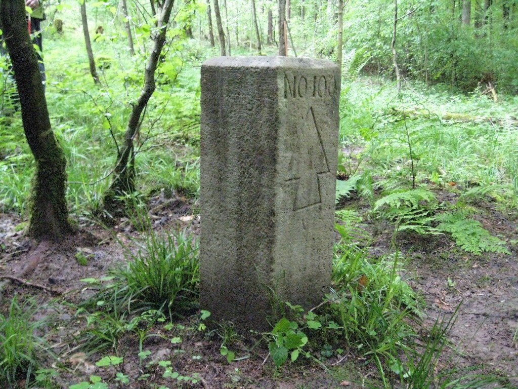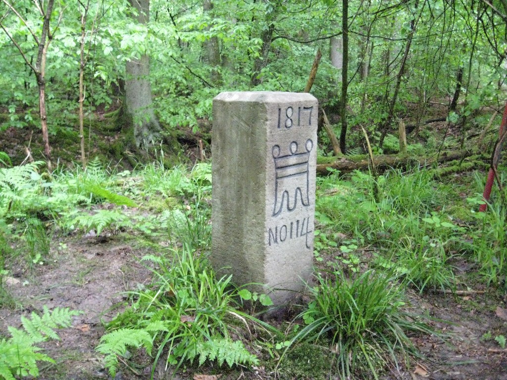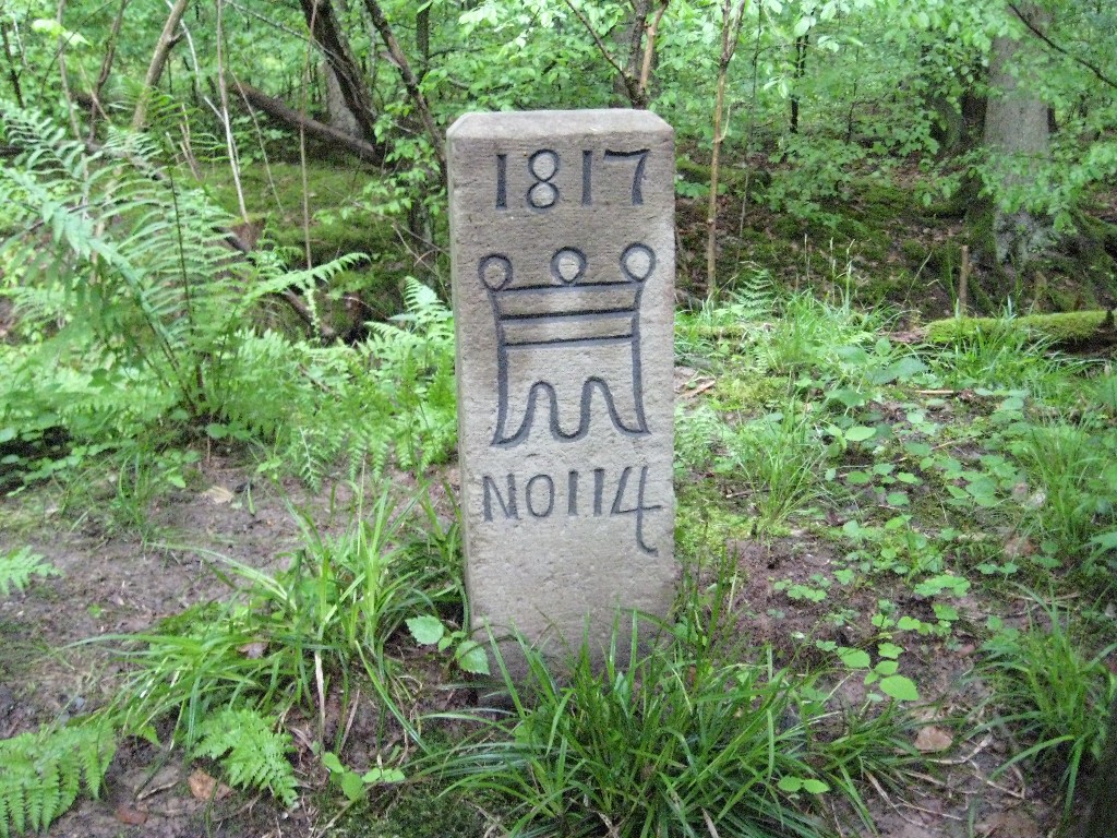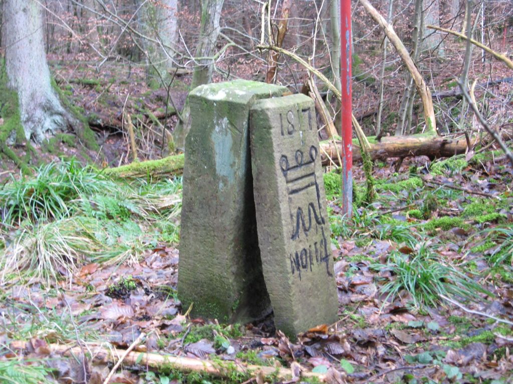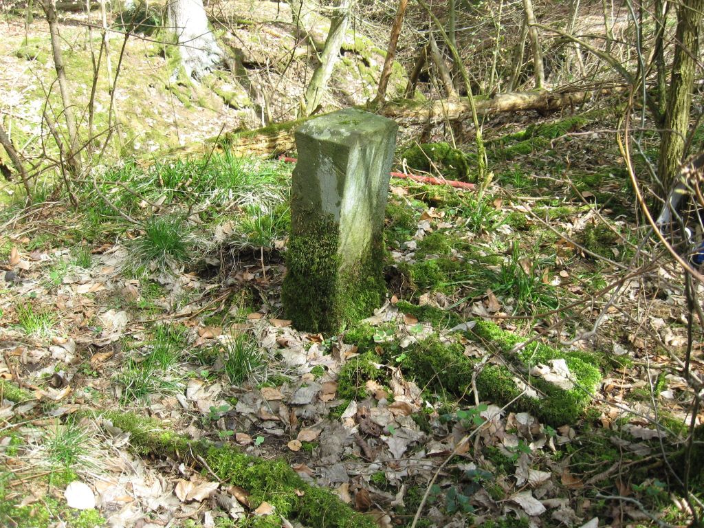 | Historische Grenzsteine, ca. 1777, außer diesem. 30 Grenzsteine in einer Reihe von 1,2 km (siehe Anlage 1). Grenzverlauf Herrenberg-Nufringen (Nr. 109 - 132 1/2), 3-Latz - Herrenberg, Pflugmesser(eisen) - Nufringen. Während die Steine Nr. 109 - 132 1/2 mit den seitlichen Nummern auf eine gemeinsame Nummerierung von Herrenberg und Nufringen schließen lassen, fallen bei diesem Markstein die doppelten Nummern auf, wobei die Nr. 114 sich den bisherigen Nummern anschließt. | flacher Kopf, Knickpunkt |