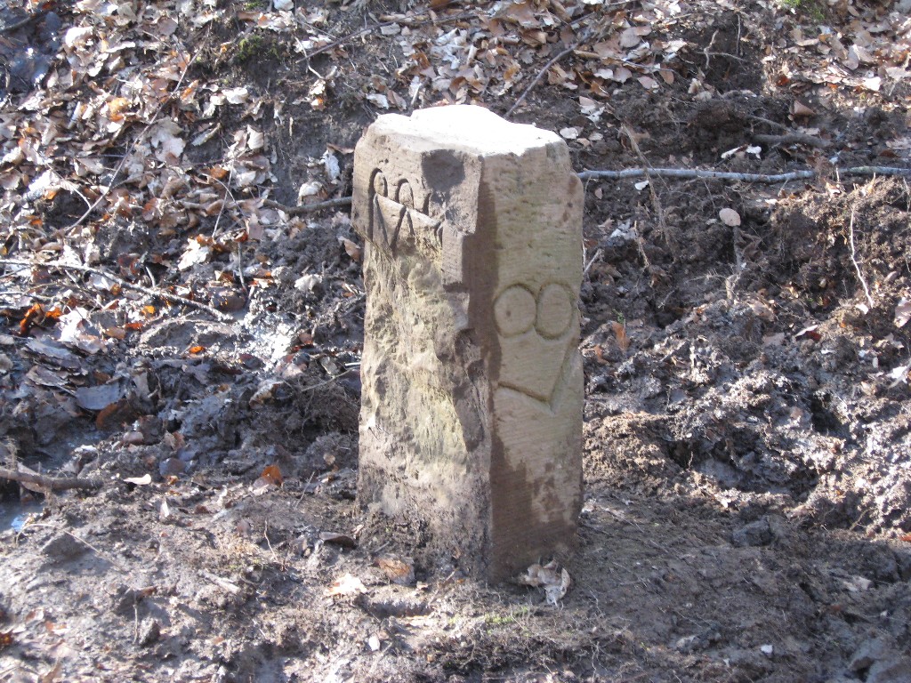 | Der 3-Latz von Herrenberg (Bild 2), das Pflugmesser steht für Hildrizhausen. Der Stein liegt im Grenzgraben heraus. Mit Fuß H=1m lang. Leider ist die Seite mit dem 3-Latz in der Zwischenzeit abgeplatzt. |