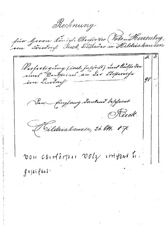 Der Stein wurde 1907 von Ludwig Volz (1864-1950) gestiftet, Forstamtsleiter in Herrenberg von 1900-1932, außer 1914-1916 im Krieg, Anlage 2. Eine Rechnung vom 21. Oktober 1907 über 90 Reichsmark liegt noch beim Forstamt, Anlage 3.