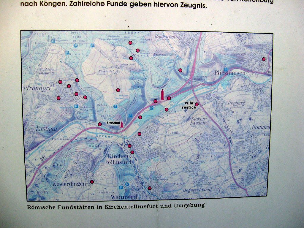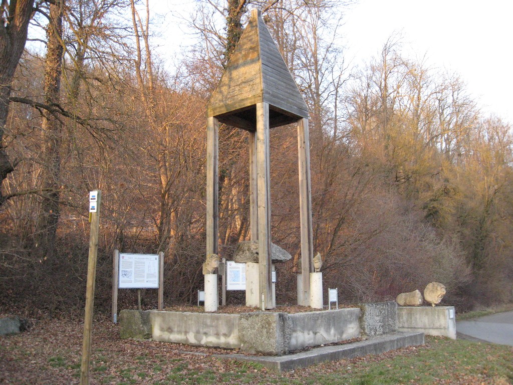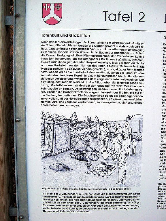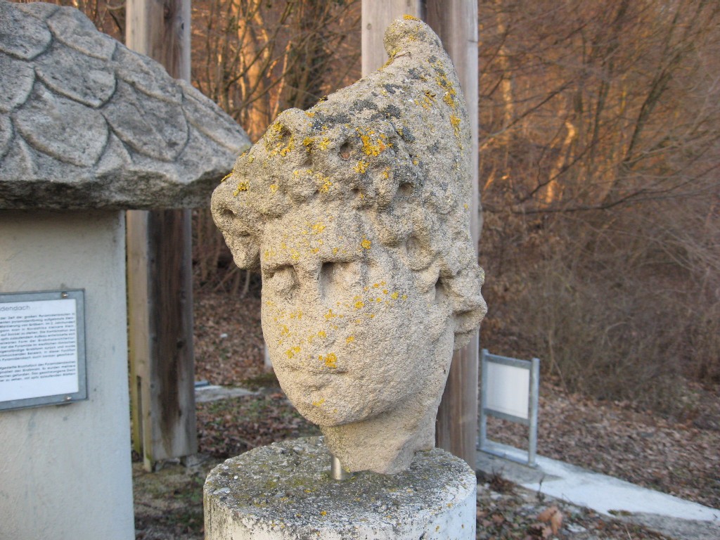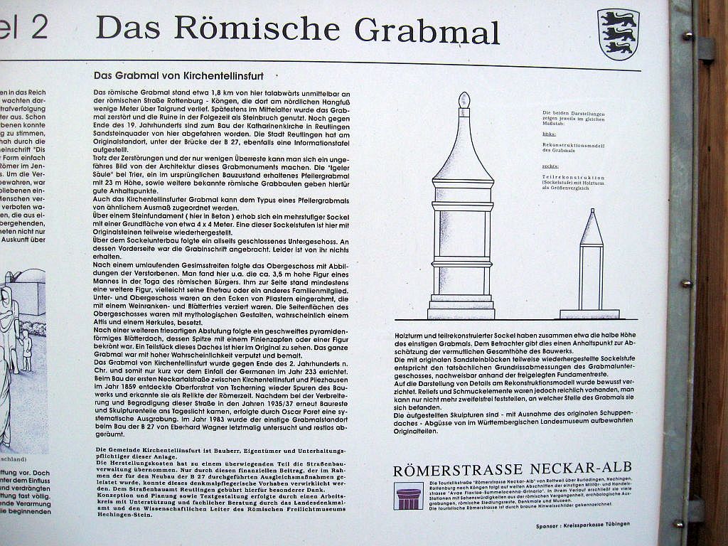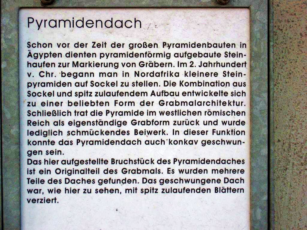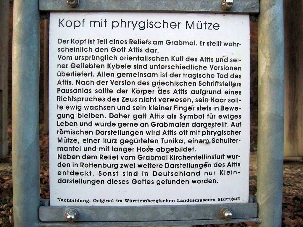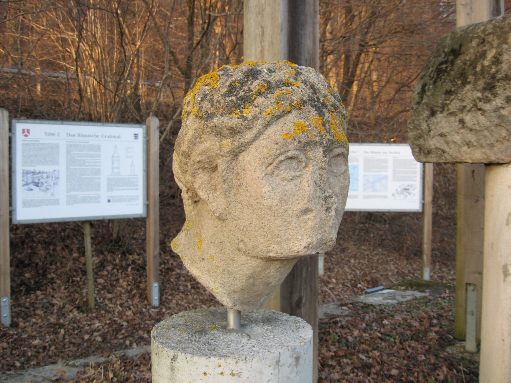 | Gefunden wurden an der einstigen Römerstraße: ein mächtiger turmartiger Grabpfeiler mit reichem Reliefschmuck, dazu 1 lebensgroßer Löwe, 2 Sphinxe, Bruchstücke von Reliefs eines Attis, eines Kämpfers, eines Jagdfrieses eines Ebers und reich profilierte Gesimse und Blöcke von einem Schuppendach. | Ensemble von römischen Bildsteinen |