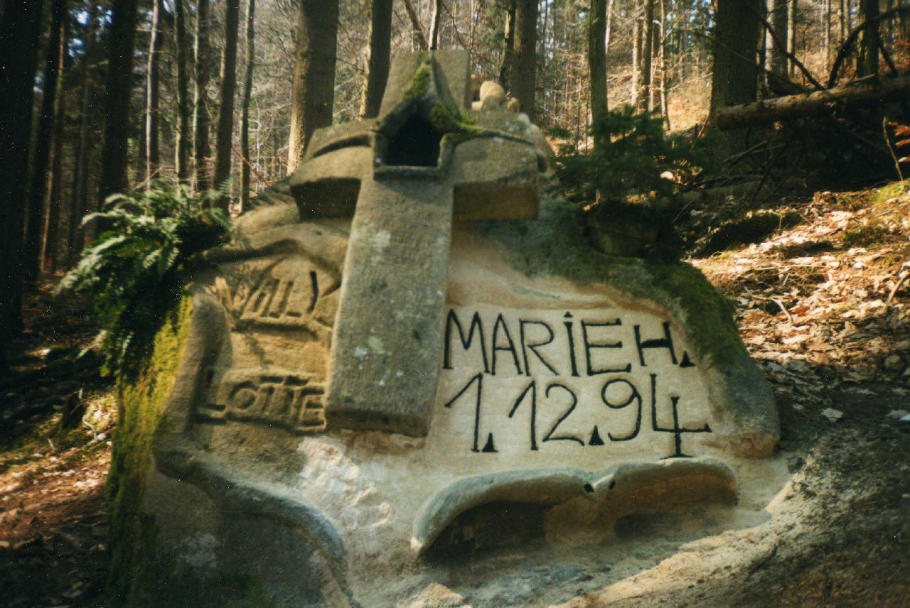 | neben dem unteren Balken des kreuzförmigen Kerzenhäuschens: links vom Betrachter aus:"Willy/ Lotte", rechts: "Marie H./ 1.12.94" |